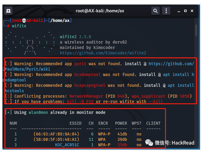[!] Warning: Recommended app hcxdumptool was not found. install @ apt install hcxdumptool