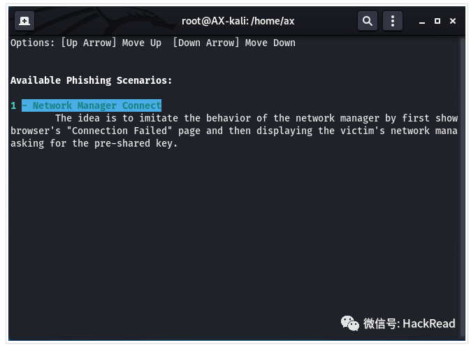 安装完成之后,把wifiphisher打开就可以开始选择热点进行钓鱼,执行以下命令