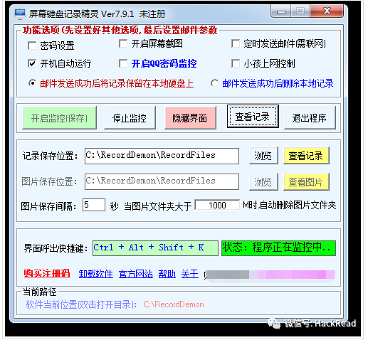 屏幕键盘记录精灵,该电脑键盘记录软件当启动监控后,键盘将详细的记录电脑上的一举一动。适用于所有应用程序,如QQ,MSN,Skype,word,excel,记事本,写字板,IE页面等任何键盘输入程序并发送到指定的邮箱内,软件功能包括:键盘的所有输入输出,定时截取屏幕图片保存到指定文件夹内,定时将记录下来的图片和文本发送到指定邮箱,电脑重启后软件能够自动隐藏运行