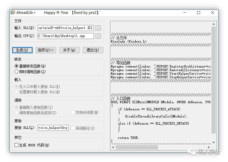 这时候我们可以使用 AheadLib 工具,使恶意的 DLL 将原有的函数转发到原 DLL 中并且释放恶意代码