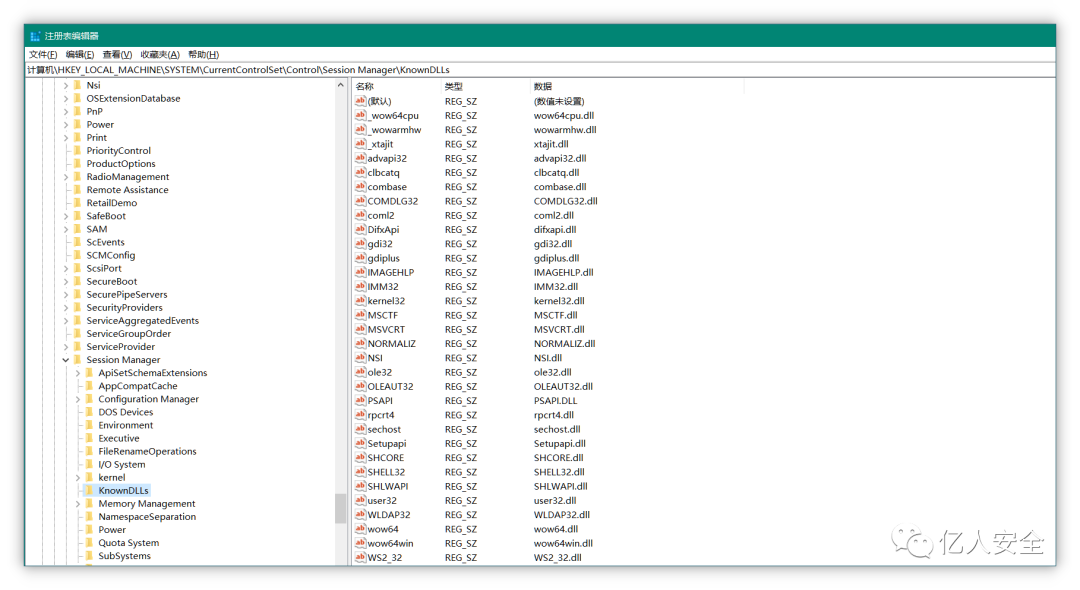 从 Windows7 之后,微软为了更进一步的防御系统的 DLL 被劫持,将一些容易被劫持的系统 DLL 写进了一个注册表项中,该项下的 DLL 文件就会被禁止从 EXE 自身所在的目录下调用,而只能从系统目录 SYSTEM32 目录下调用,其注册表位置: