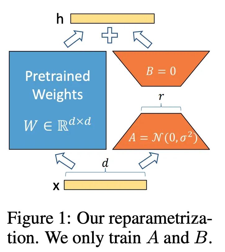 现在,你应该能理解 LoRA 论文原文中的这种图了。注意,这里,LoRA 是对原深度神经网络的每一层都设计了对应 BA 矩阵。