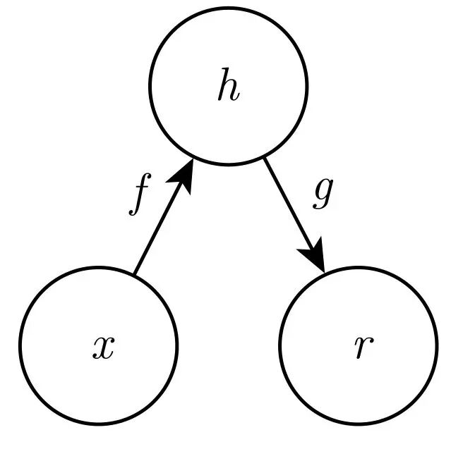 在深度学习领域里,下面这个就是最简单的编码-解码模型示意图。f 函数是编码器,把输入 x 变成某个叫做 h 的东西,g 是解码函数,把编码出来的东西,解码成输出 r。