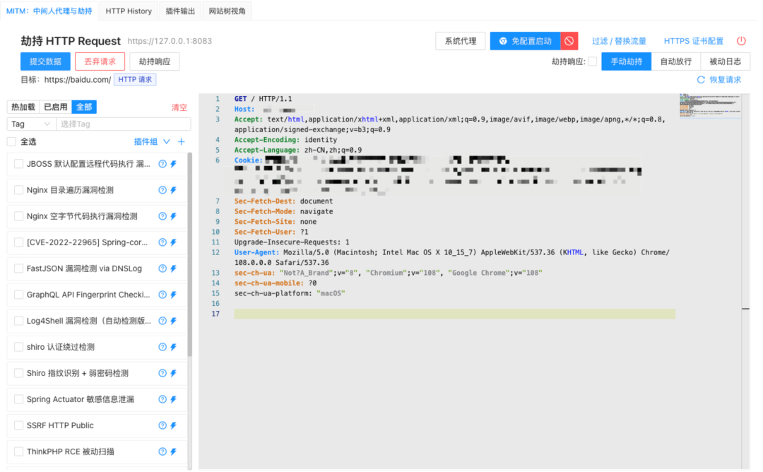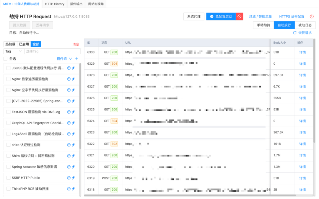 MITM 操作台可百分百替代 BurpSuite执行所有操作(下载并安装证书、劫持请求、响应、编辑劫持到的数据包等)。并且提供一整套顺畅的工作流,劫持=>History=>Repeater/Intruder,劫持数据,在History查看历史数据,选择需要“挖掘”的数据包,发送到Web Fuzzer进行Repeater/Intruder操作。除了这些典型的操作场景外,MITM还提供了插件被动扫描、热加载、数据包替换、标记等更灵活的功能。