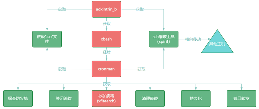 这两个shell文件功能高度相似,且作用于攻击的整个生命周期。其主要行为包括:获取恶意文 件、运行挖矿病毒、持久化、清楚记录、横向移动。