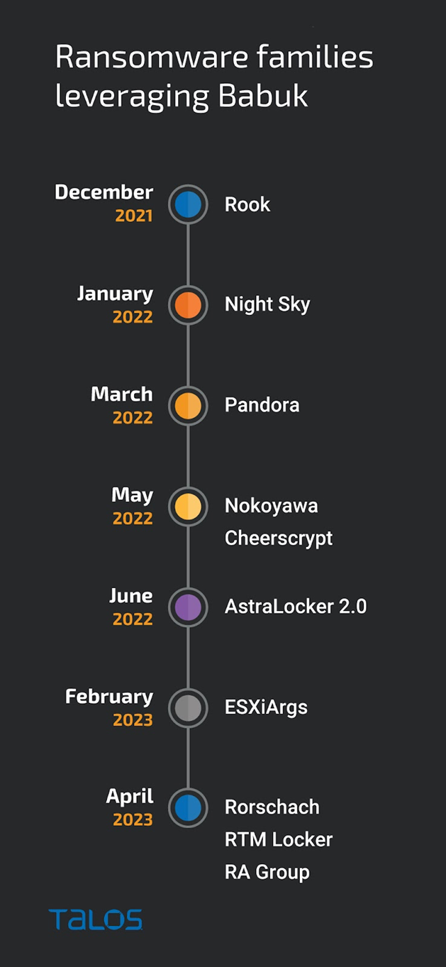研究人员最近发现了一个新的勒索软件参与者 RA Group,它于 2023 年 4 月出现,似乎在其攻击中使用了泄露的 Babuk 源代码。2021 年 9 月,据称 Babuk 组织成员泄露了其勒索软件的完整源代码后,利用泄露的 Babuk 代码出现了各种勒索软件系列。研究人员编制了这些攻击的时间表,这些攻击是由不同的参与者使用从泄露的源代码分支出来的勒索软件系列进行的。