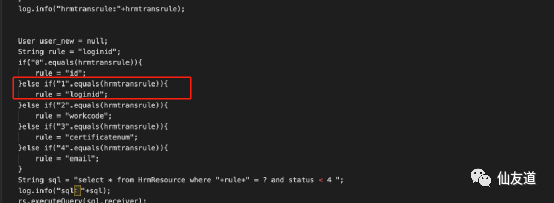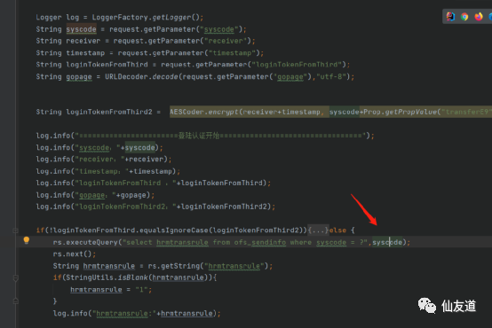 loginTokenFromThird为sign签名,AES加密,key为Prop.getPropValue("transferE9","secretkey"),从配置文件中读取, 如果相等则执行SQL在hrmtransrule表查syscode,查不到=1,