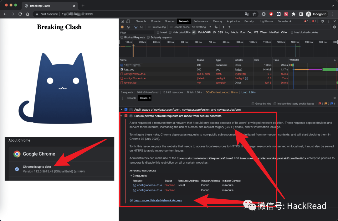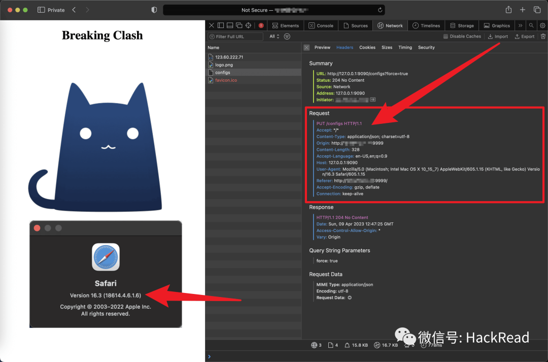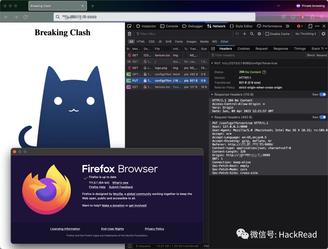当macOS用户在日常使用ClashX时,此时打开一条来自攻击者发过来的恶意链接时,浏览器就会自动去请求Clash的RESTful API,如下图所示,使用最新版Firefox和Safari浏览器都成功对本地Clash发出了请求,Firefox和Safari浏览器比较宽松。