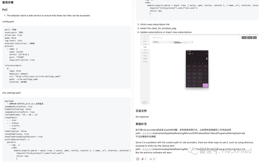 CFW路径穿越致使parsers JS RCE - 2023/01/13 Windows 上的 clash_for_windows 在 0.20.12 在订阅一个恶意链接时存在远程命令执行漏洞。因为对订阅文件中 rule-providers 的 path 的不安全处理导致 cfw-setting.yaml 会被覆盖,cfw-setting.yaml 中 parsers 的 js代码将会被执行。