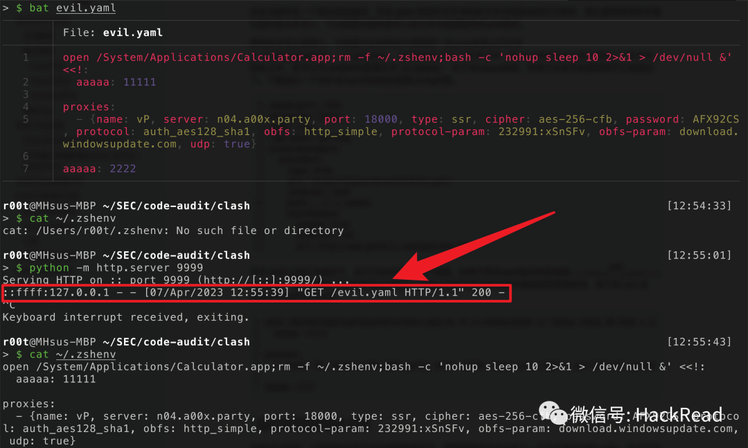 观察HTTP日志可以发现,来自Clash的请求,请求evil.yaml文件,并将其写入至本地../../.zshenv路径。