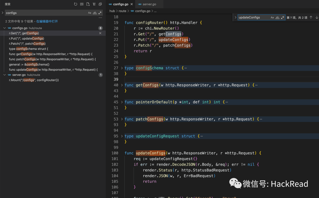 对重新加载配置文件功能点进行白盒代码审计,首先先跟进/configs路由的代码。