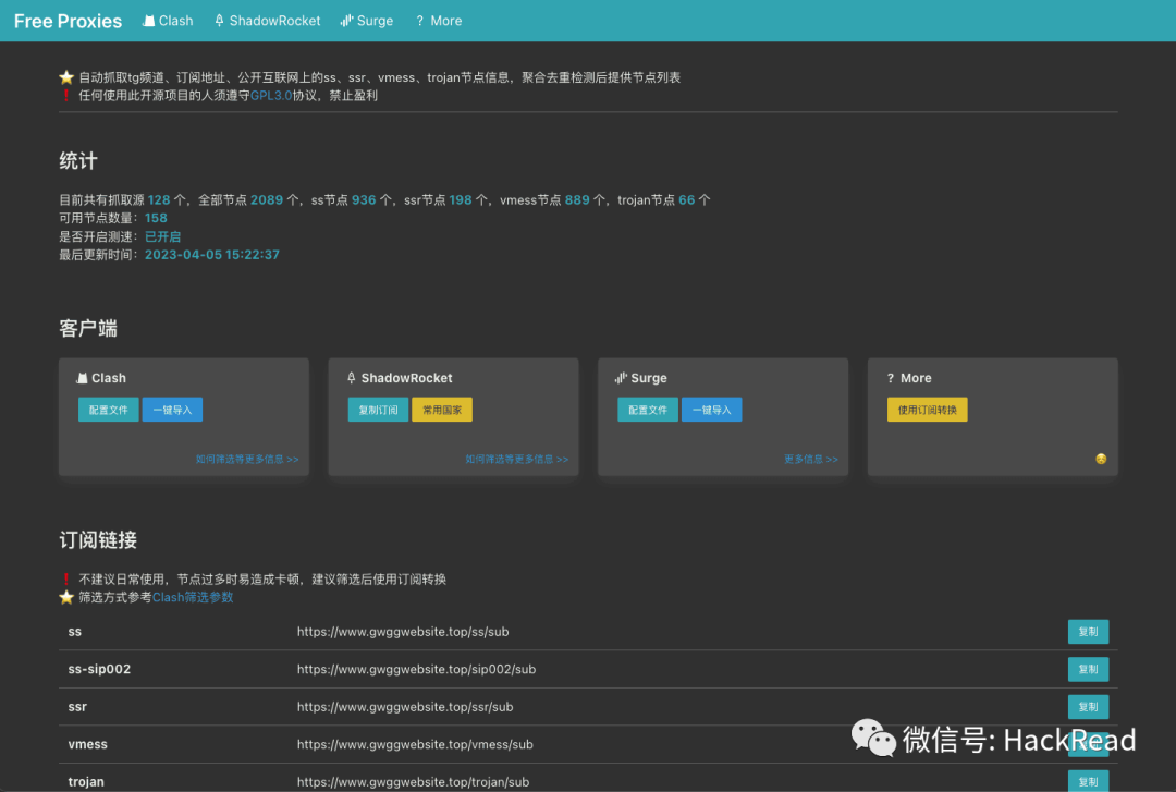 1 2 3 4 5 6 7 8 9 10 11 12 13 14 15 16 17 18 19 20 21 $ curl https://www.gwggwebsite.top/clash/config -o ~/.config/clash/config.yaml $ head -n 20 ~/.config/clash/config.yaml# 所有节点均从公开互联网上抓取,使用clash自动检查可用性即可 # 抓取程序已开源:https://github.com/zu1k/proxypool # port of HTTP port: 7890