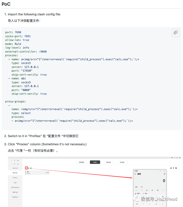 0x01 历史漏洞 CFW XSS2RCE - 2022/02/23 Clash For Windows是由Electron提供的。如果一个XSS有效载荷是以代理的名义,我们可以在受害者的电脑上远程执行任何JavaScript代码。