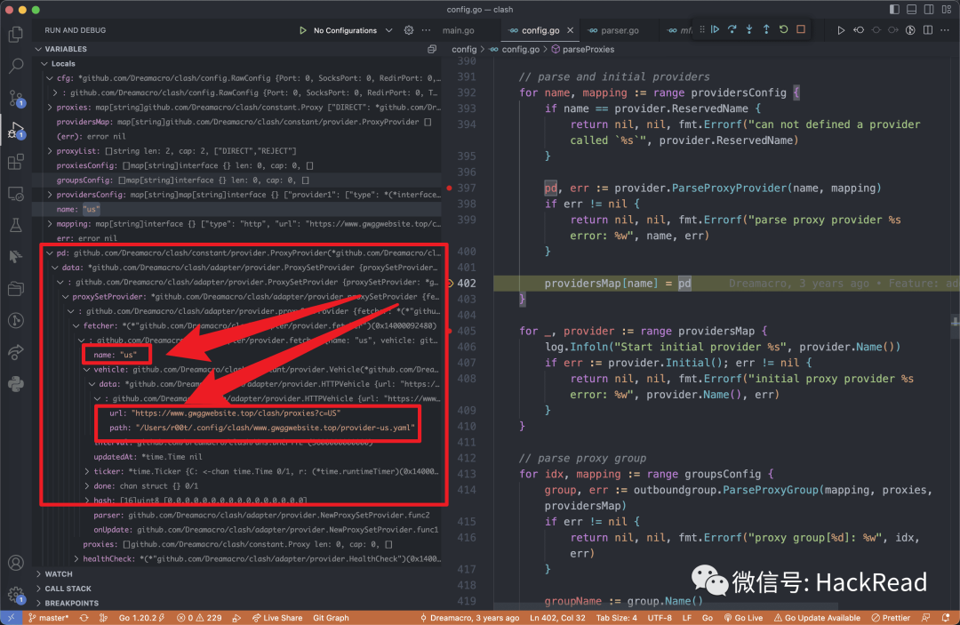 回到上面,Resolve会将/Users/$USERNAME/.config/clash/与主配置文件中proxy-providers的path参数值www.gwggwebsite.top/provider-us.yaml进行拼接,然后返回到ParseProxyProvider函数中的path变量,最后path变量的值为/Users/$USERNAME/.config/clash/www.gwggwebsite.top/provider-us.yaml,当然如果你是Linux系统,会略有所不同。