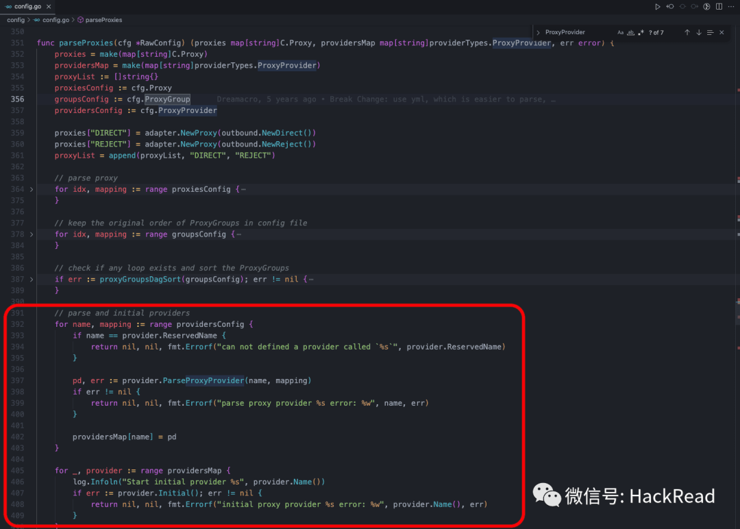 然后再进入到ParseRawConfig函数,其中发现parseProxies函数。