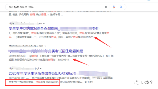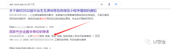 这个语句是寻找这个学校的相关域名的站点,但是在这个后面加一些敏感信息就可以指定查找了,比如:site:xxx.edu.cn sfz site:xxx.edu.cn xh 这样的等条件。