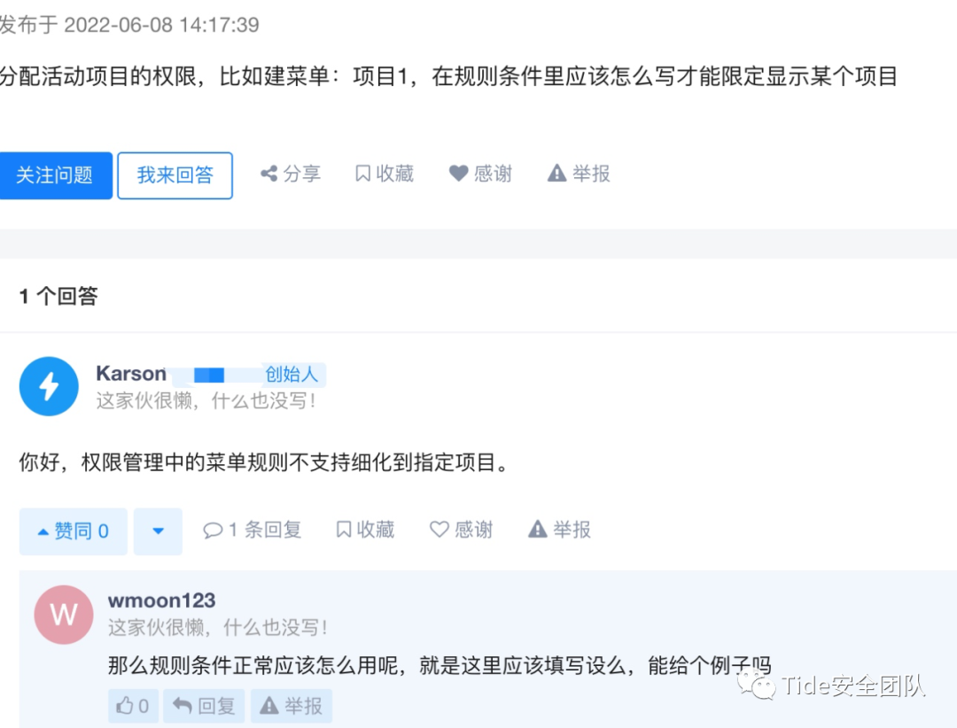 在这段截取的代码中,尾部的位置有个明晃晃的eval几个大字啊。这是要干嘛,这是要留后门啊。寻求开发的说辞,截图如下:"/^(\w+)\s?([\>\<\=]+)\s?(.*)$/"。里面包含大小于号,确实是一个条件的判断。正常的逻辑权限控制,都是某个角色有哪个权限,这里使用的场景,可能角色里面还能再判断细分吧。不过,一直没用过。未解其中味啊。二:为什么非要小权限,看下图: