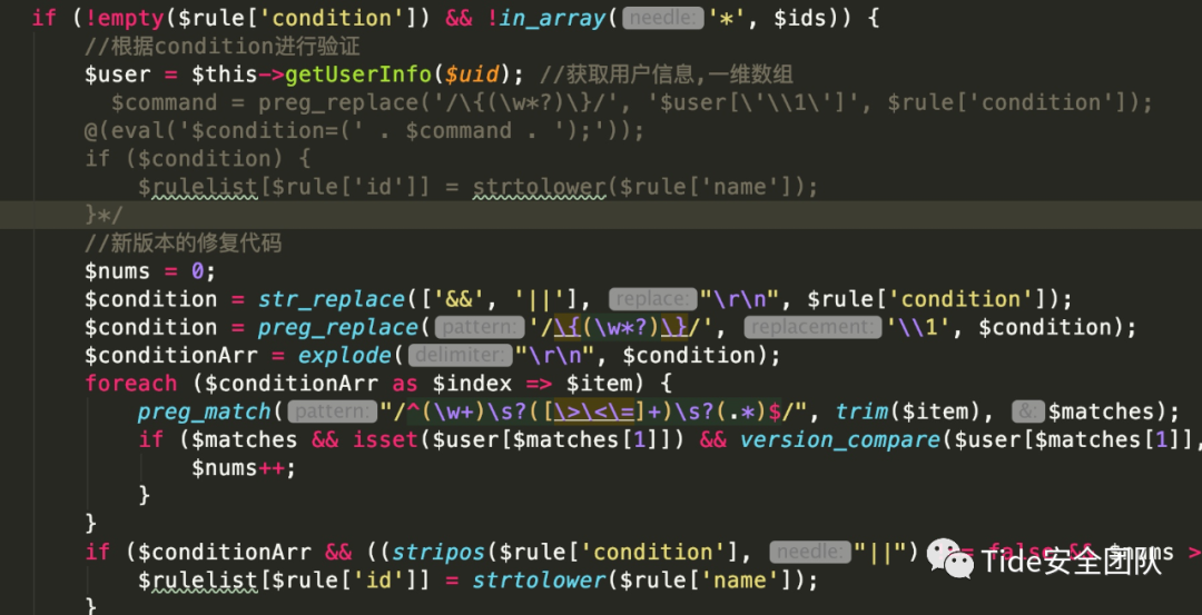 $nums = 0;$condition = str_replace(['&&', '||'], "\r\n", $rule['condition']);$condition = preg_replace('/\{(\w*?)\}/', '\\1', $condition);$conditionArr = explode("\r\n", $condition);foreach ($conditionArr as $index => $item) {preg_match("/^(\w+)\s?([\>\<\=]+)\s?(.*)$/", trim($item), $matches);if ($matches && isset($user[$matches[1]]) && version_compare($user[$matches[1]], $matches[3], $matches[2])) {$nums++;}}if ($conditionArr && ((stripos($rule['condition'], "||") !== false && $nums > 0) || count($conditionArr) == $nums)) {$rulelist[$rule['id']] = strtolower($rule['name']);}