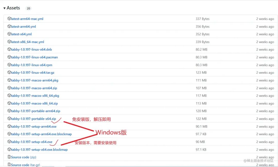 点击Tabby发布版本下载地址,找到最新发布版本(目前最新版本是1.0.197) 往下滑动,找到 Assets 字样,根据自己电脑需求下载即可,我电脑是64位Win10系统,下载的tabby-1.0.197-portable-x64.exe。