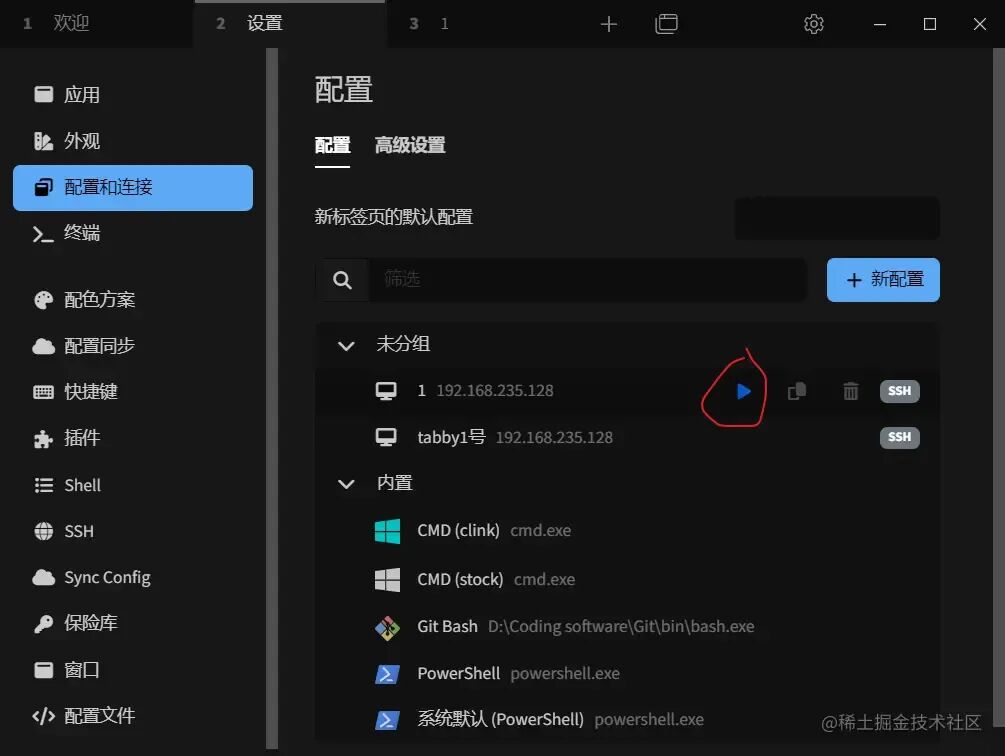 打开Tabby后,可以看到右上角有个齿轮(设置),点下会出现下图所示的菜单栏,然后 1.选择配置和连接 2.添加新配置 3.选择SSH连接