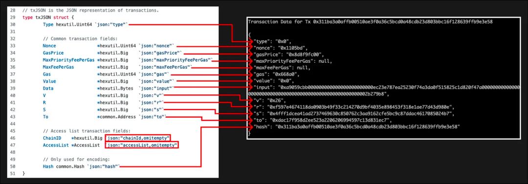 通过 Geth 的 ethclient 查询,可以看到 ChainId 和 AccessList 都有 "omitempty",这意味着如果该字段为空,则将在响应中被省略,以减少或甚略序列化后数据的大小。