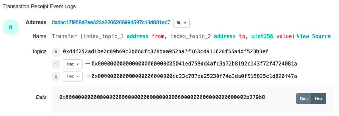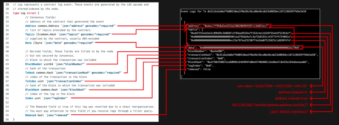 address 字段是发出事件的合约地址,有关这个字段的一个重要说明是,尽管它未包含在 topic 部分中,它也将被索引。原因在于 Transfer 事件是 ERC20 标准的一部分,这意味着当需要过滤筛选 ERC20 转账事件的日志时,将从所有的 ERC20 合约中获取转账事件。而通过索引合约地址,可以将搜索范围缩小到特定的合约 / 代币,如示例中的 USDT。