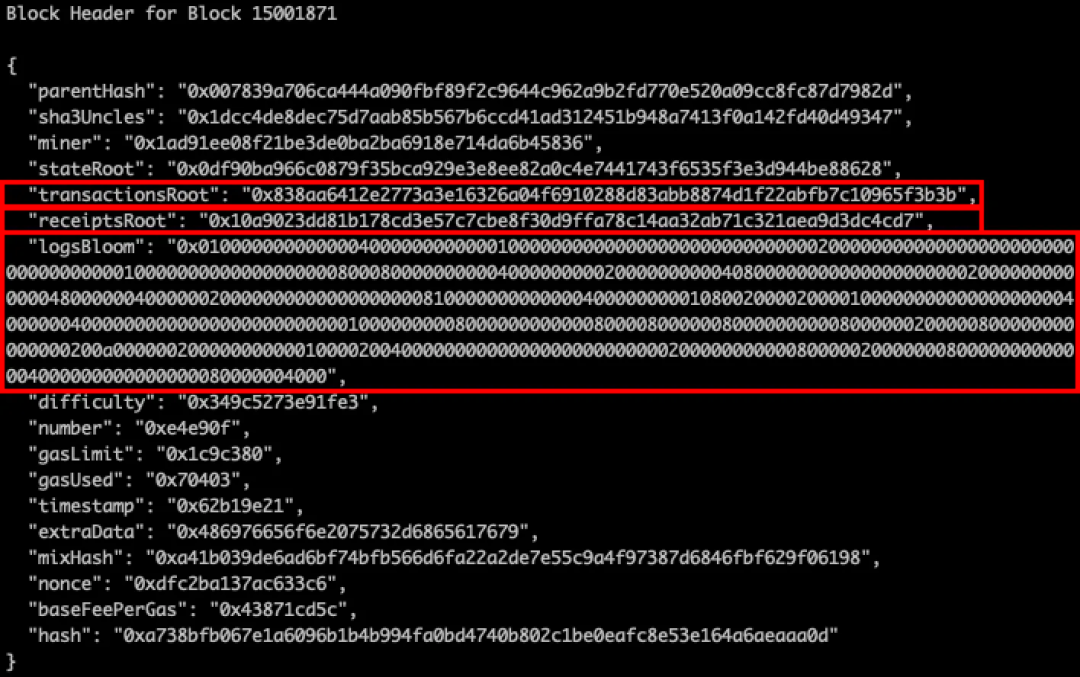 通过以太坊节点查询到 15001871 区块的区块头信息如下: