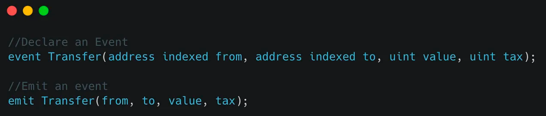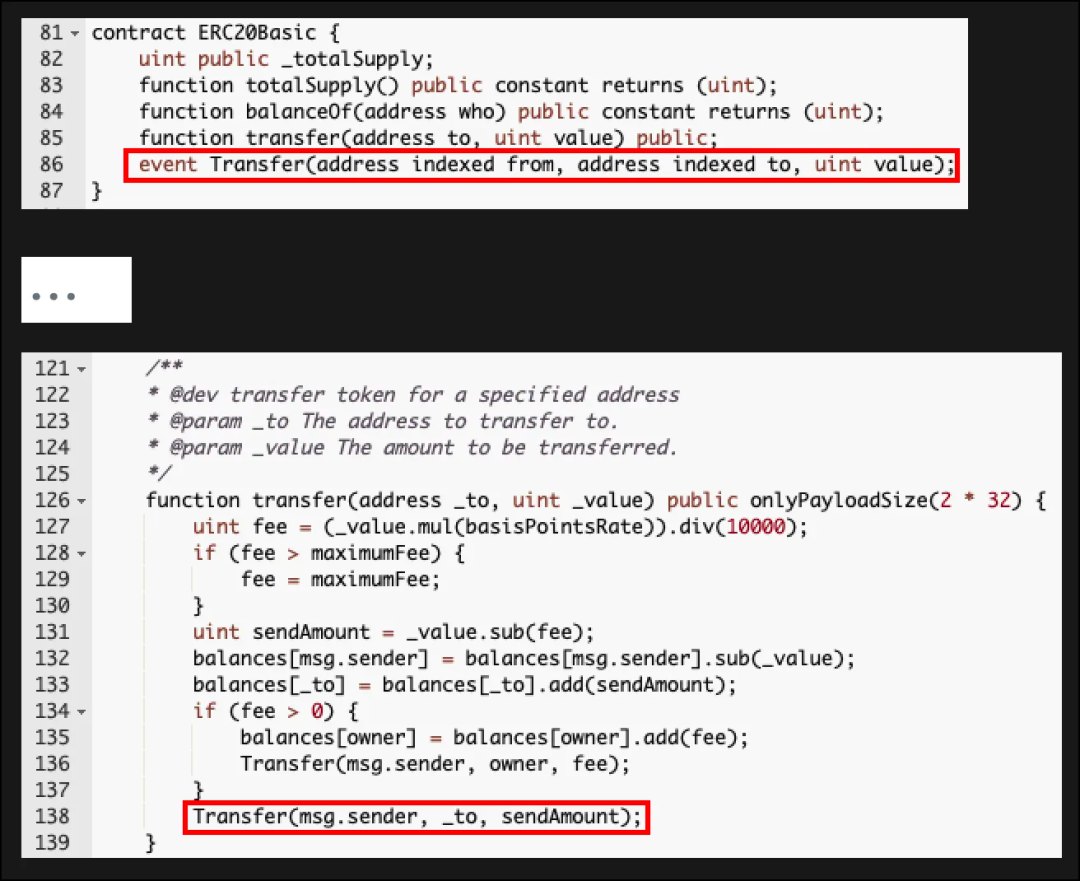 当事件输入被 “索引” 时,它可以让我们通过该输入快速查找日志。例如,使用上面的索引 "from" 时,可以在区块 X 和 Y 之间获取所有 "from" 地址为 0x5041ed759dd4afc3a72b8192c143f72f4724081a 的 Transfer 类型的事件日志。我们还可以看到,在第 138 行调用 transfer 函数时,会触发事件日志。值得注意的是,当前合约使用的 solidity 版本较早,因此缺少 emit 关键字。