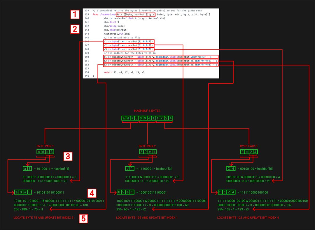 (代码源:https://github.com/ethereum/go-ethereum/blob/d8ff53dfb8a516f47db37dbc7fd7ad18a1e8a125/core/types/bloom9.go)