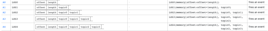 最后就是 LOG 操作码。它们从不包含 topic 时的 LOG0 到包含 4 个 topics 时的 LOG4。LOG3 是我们示例中使用的内容。包含如下: