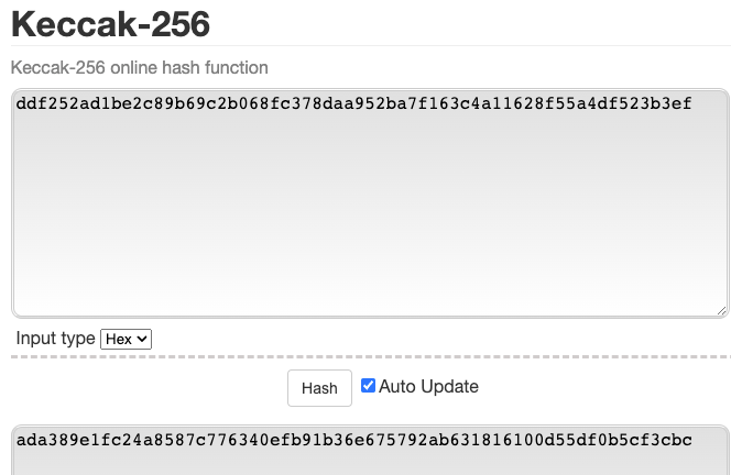 1)使用 keccak256 的 sha 输出的十六进制结果为(当使用 keccak 256 作为函数签名时,输入是文本类型,而这里是十六进制类型):ada389e1fc24a8587c776340efb91b36e675792ab631816100d55df0b5cf3cbc。