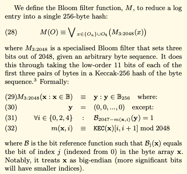 “我们定义 Bloom filter 函数为 M,将日志条目缩减到单个 256 字节哈希中: