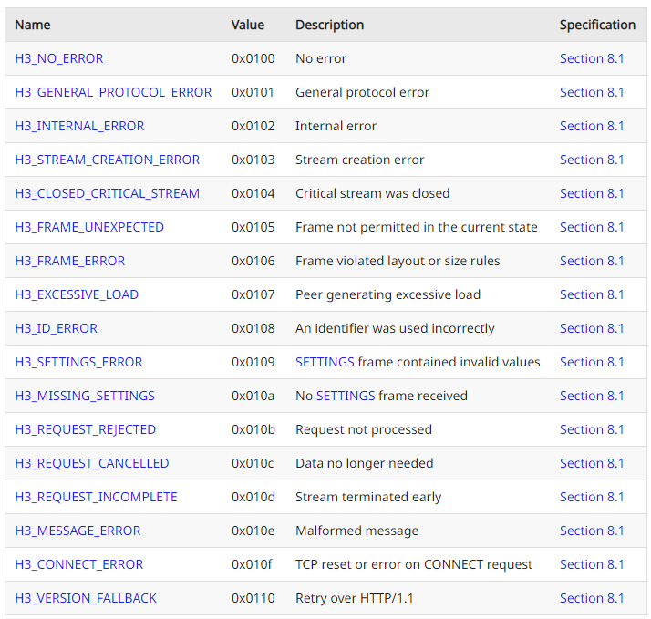 下表中的条目是本文所介绍的。这些错误代码是从对规范要求策略运行的范围中选择的,以避免与 HTTP/2 错误代码冲突。