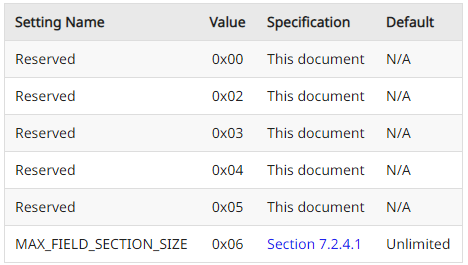 终端可以使用 SETTINGS_MAX_FIELD_SECTION_SIZE(第 4.2.2 节)设置来通知对等方可能适用于字段部分大小的限制。此设置只是建议性的,因此终端可以选择发送超出此限制的字段部分,并有可能将请求或响应视为格式错误。此设置特定于 HTTP/3 连接,因此任何请求或响应都可能遇到具有较低未知限制的跃点。中间人可以尝试通过传递不同对等方提供的值来避免这个问题,但他们没有义务这样做。