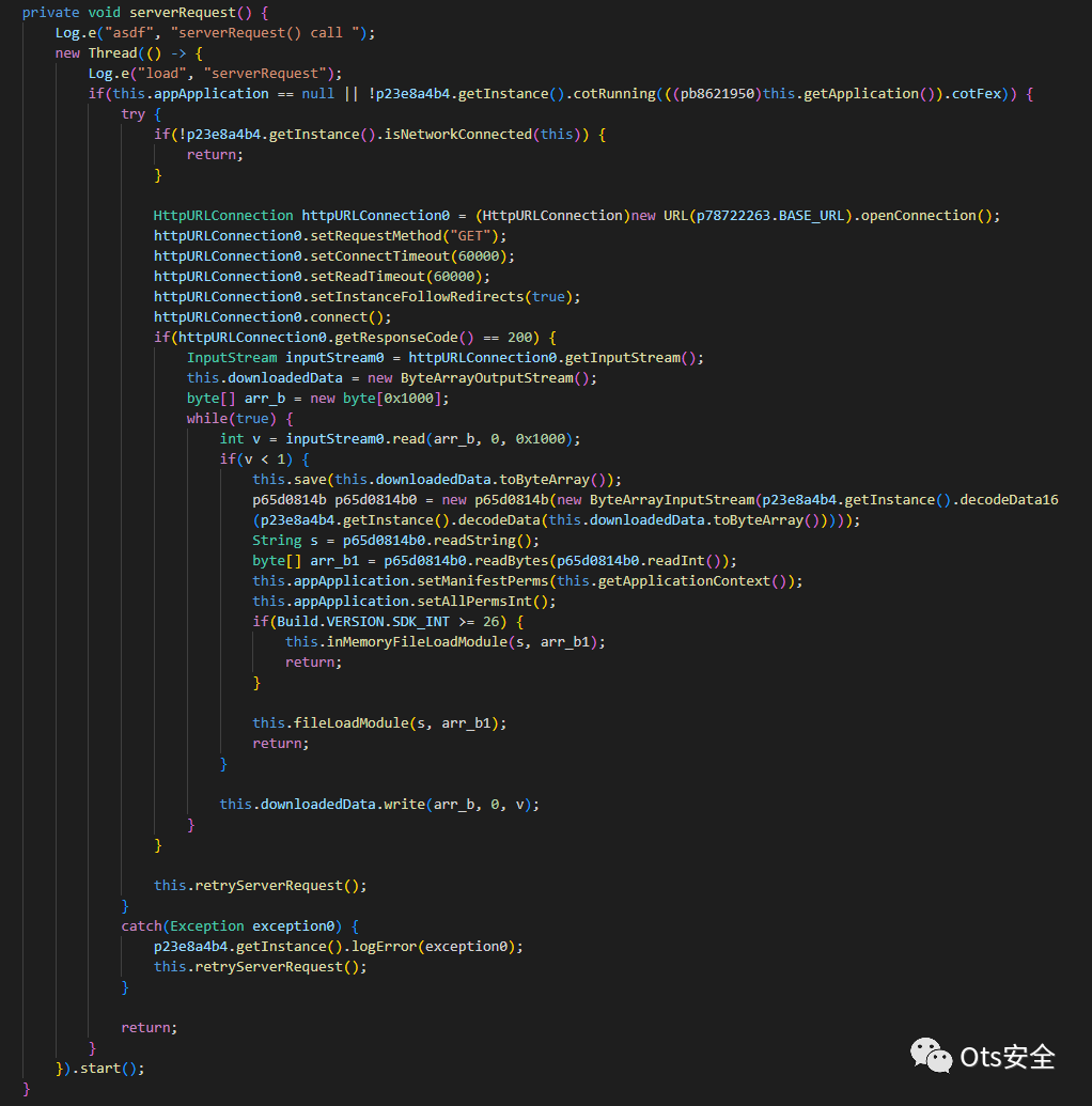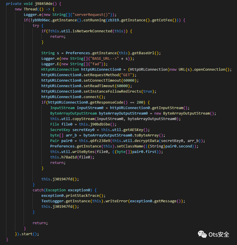 该应用程序是一种下载器类型的恶意软件,可在hxxps://games[.]srv-app[.]co/669/1/1970/2/0/0/1764305594/2X1R9Tw7c5eSvLpCCwnl0X7C0zhfHLA6RJzJ0ADS/files-82dfc144/ 下载加密的负载附加。负载是一个DEX 文件,使用类DexClassLoader启动。