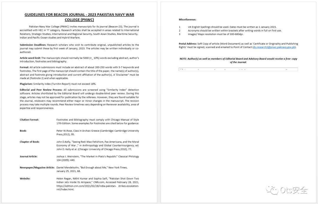 恶意文件GUIDELINES FOR JOURNAL – 2023 PAKISTAN NAVY WAR COLLEGE (PNWC).docx是发现推特用户@RedDrip7。