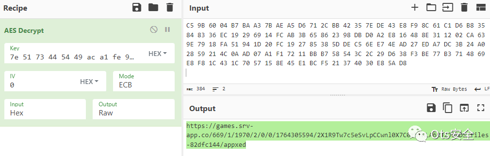 该链接使用AES-256 ECB算法进行Base64编码和加密,密钥为 {7e 51 73 44 54 49 ac a1 fe 99 25 f3 25 29 58 e3 5a 45 7c cd 89 d4 87 78 34 3f b2 df c2 60 2c 21}(32 字节)。