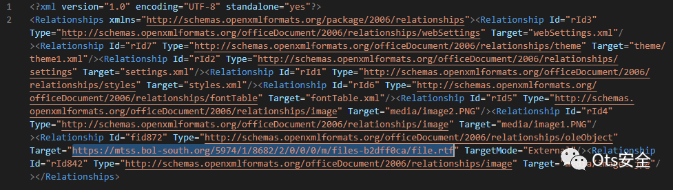 在 /word/_rels/document.xml.rels 中,恶意文档包含一个下载模板的链接:hxxps://mtss[.]bol-south[.]org/5974/1/8682/2/0/0 /0/m/files-b2dff0ca/file.rtf