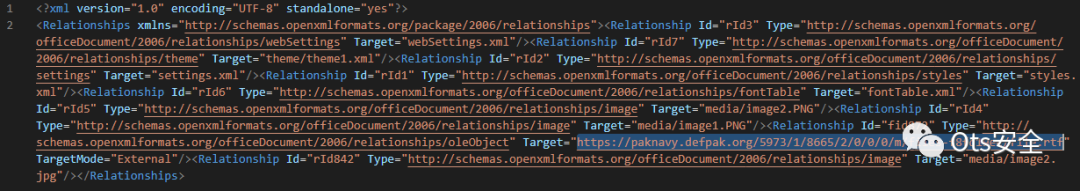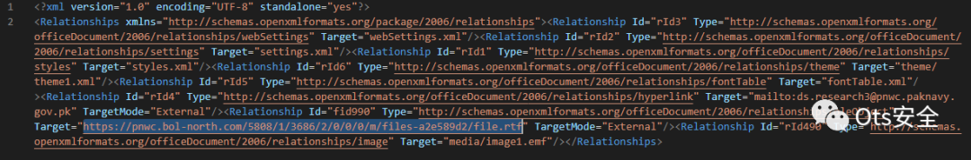 在 /word/_rels/document.xml.rels 中,恶意文档包含一个下载模板的链接:hxxs://paknavy[.]defpak[.]org/5973/1/8665/2/0/0/0 /m/files-f8fd19ec/file.rtf