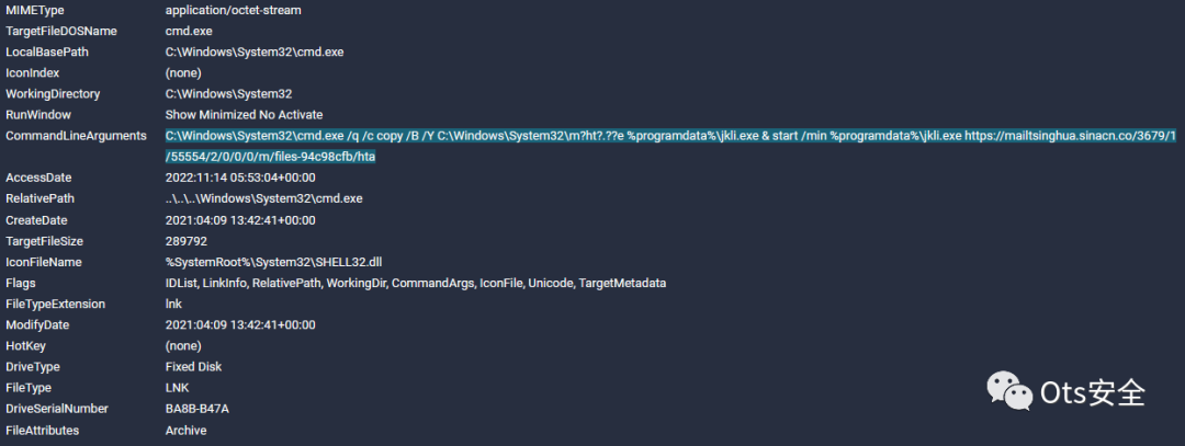LNK 文件创建一个名为 %ProgramData%\jkli.exe 的 %Windows%\System32\mshta.exe 副本,并启动 jkli.exe (mshta.exe) 以下载并执行位于 hxxps 的 HTA 文件://mailtsinghua[.]sinacn[.]co/3679/1/55554/2/0/0/0/m/files-94c98cfb/hta.