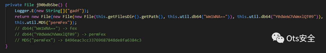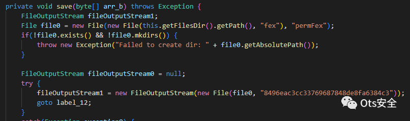 将从命令和控制 (C2) 服务器下载的文件保存为“/data/data/<package_name>/files/fex/permFex/8496eac3cc33769687848de8fa6384c3”: