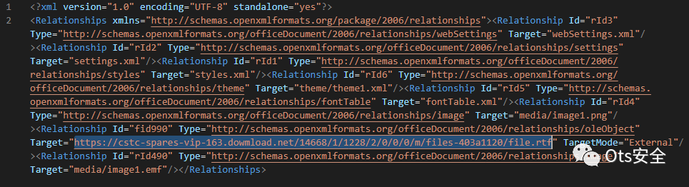 在 /word/_rels/document.xml.rels 中,恶意文档包含一个下载模板的链接:hxxps://cstc-spares-vip-163[.]dowmload[.]net/14668/1/1228/2 /0/0/0/m/files-403a1120/file.rtf