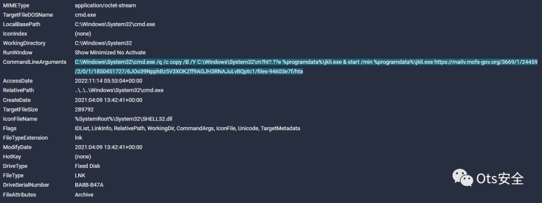 LNK 创建一个名为 %ProgramData%\jkli.exe 的 %Windows%\System32\mshta.exe 副本并启动 jkli.exe (mshta.exe) 以下载并执行位于 hxxps://mailv[ .]mofs-gov[.]org:443/3669/1/24459/2/0/1/1850451727/6JOo39NpphBz5V3XOKZff9AGJH3RNAJuLvBQptc1/files-94603e7f/hta。该LNK文件类似于上述LNK文件公管学院关于11月22日起工作安排调整整的通知.docx.lnk。