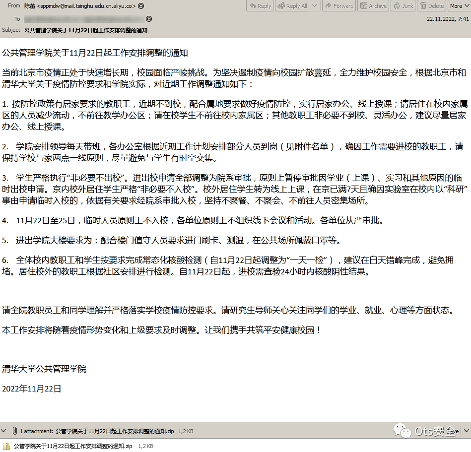 此 LNK 文件包含在公管学院于 11 月 22 日起工作安排调整的通知.zip 档案中,该档案是通过以下方式分发的电子邮件: