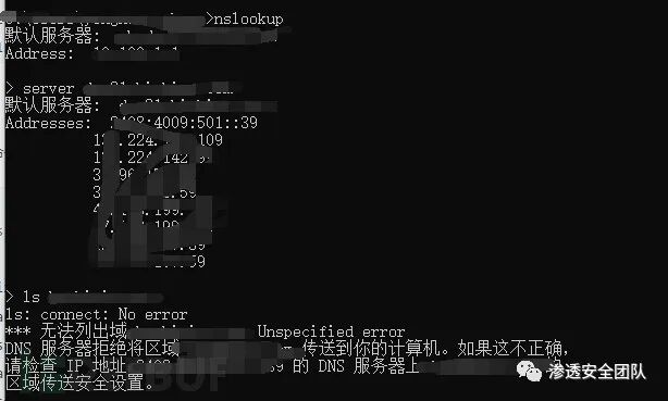 nslookup server dns服务 ls domain (这种方式可以查询到是否存在DNS域传送漏洞)