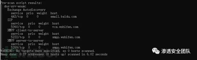 nmap --script dns-srv-enum.nse --script-args "dns-srv-enum.domain='baidu.com'"