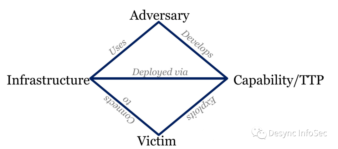 Sergio Caltagirone、Andrew endergast 和 Christopher Betz 多年前在情报界提出了钻石模型的概念。以下所有内容都基于那篇论文“The Diamond Model of Intrusion Analysis”。建议读者通读这篇论文,链接:https://www.activeresponse.org/wp-content/uploads/2013/07/diamond.pdf