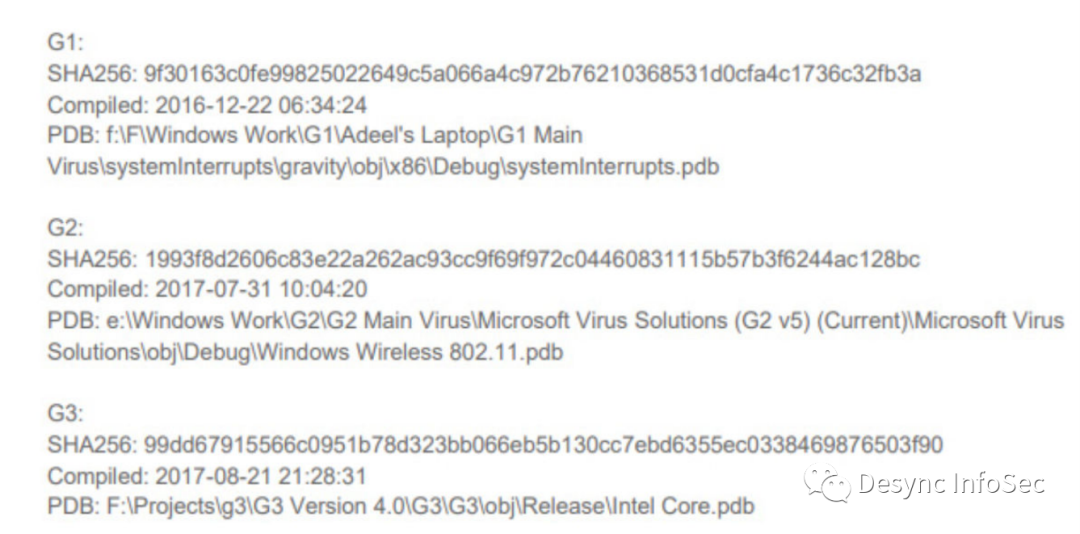 在上图示例中,我们可以看到GravityRAT的PDB字符串显示了开发者使用的文件路径、PC用户名、项目名称、CPU架构的信息。这些信息为追踪攻击组织提供了数据支持。