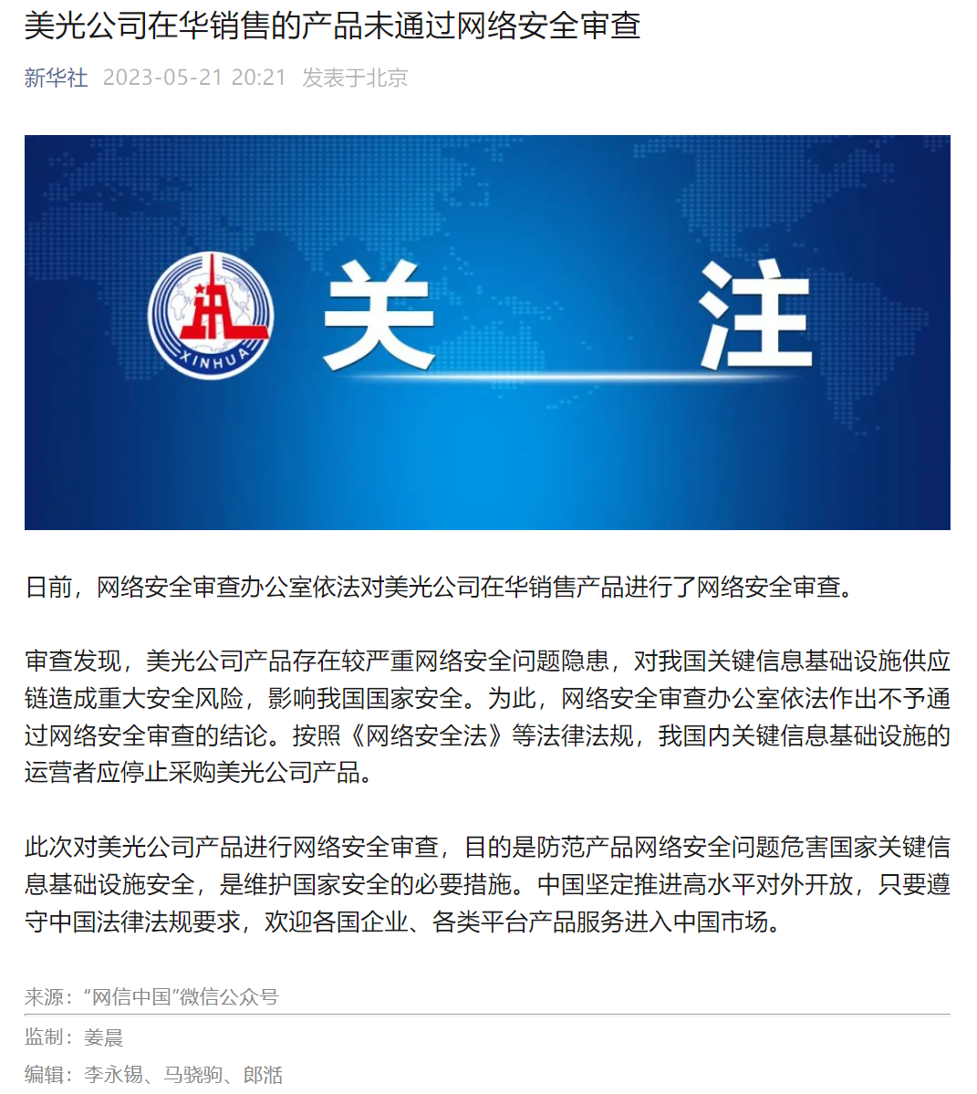 美光公司在华销售的产品未通过网络安全审查日前,网络安全审查办公室依法对美光公司在华销售产品进行了网络安全审查。审查发现,美光公司产品存在较严重网络安全问题隐患,对我国关键信息基础设施供应链造成重大安全